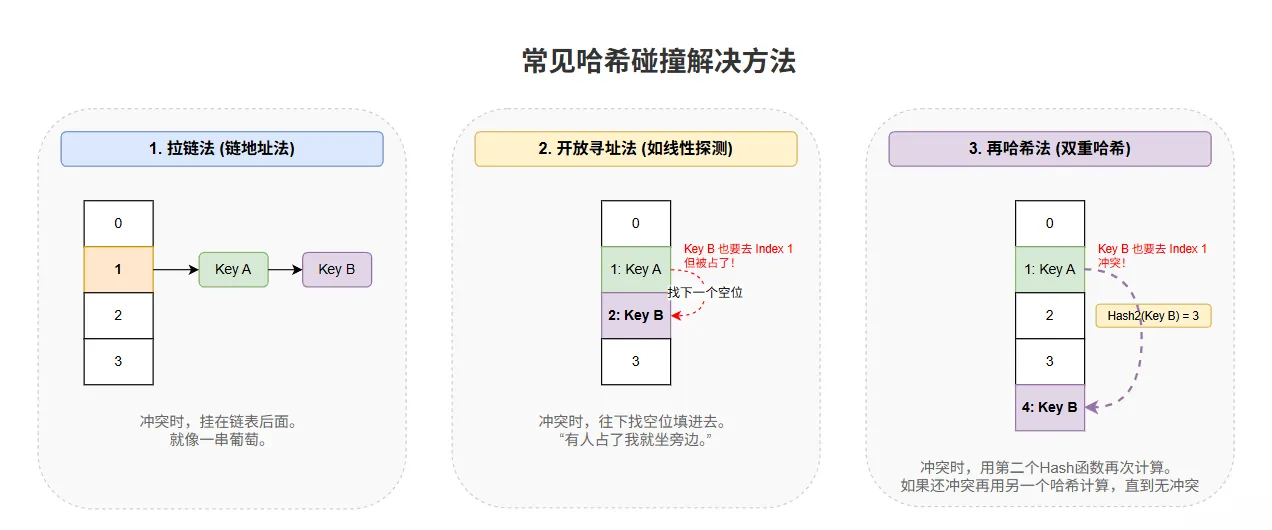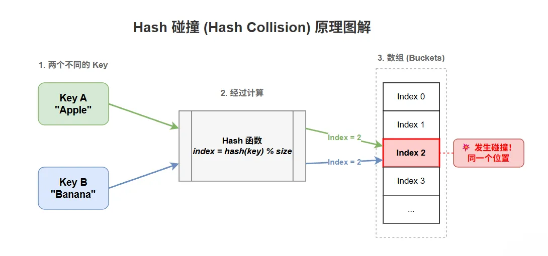 ✅ 关键:4 个不同字符串,哈希值最后 4 位全是0011,桶位置都为 3—— 典型的「低位特征相同」,直接导致哈希冲突。