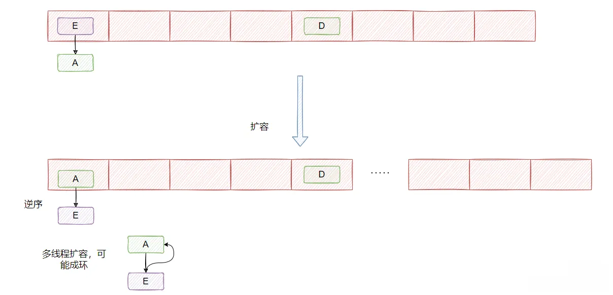 - 此过程会将原链表/红黑树拆分为两个子结构,分别存入新桶,避免结构过长。