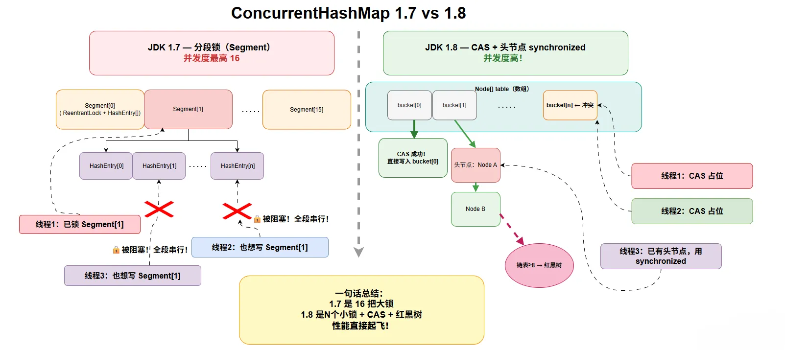 ConcurrentHashMap替代。 - 树化与退化:链表≥8且容量≥64时树化;红黑树节点≤6时退化回链表(避免频繁转换开销)。