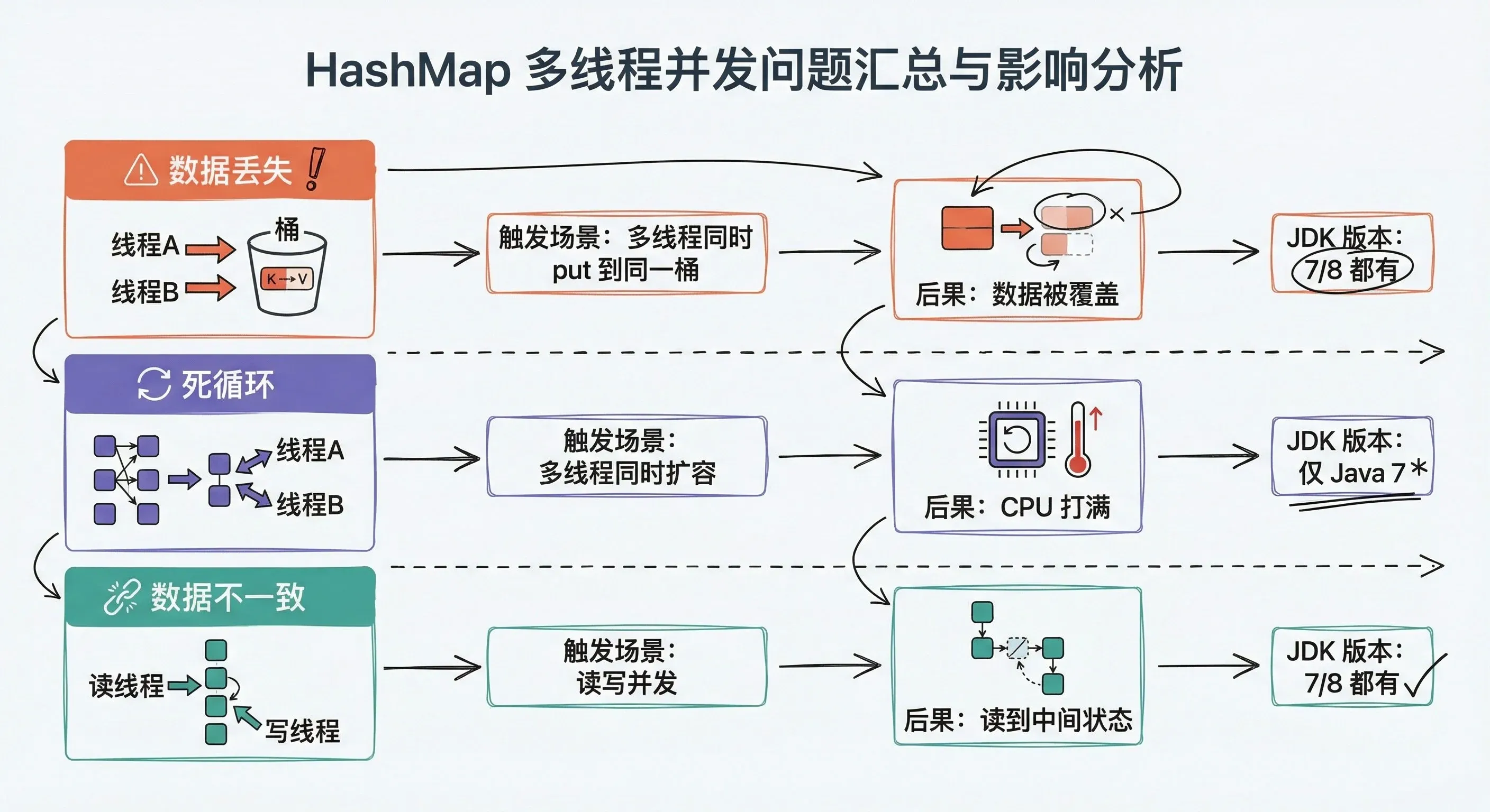 - 非线程安全:多线程并发修改可能导致数据覆盖(JDK 1.8)或环形链表死循环(JDK 1.7头插法),需用
