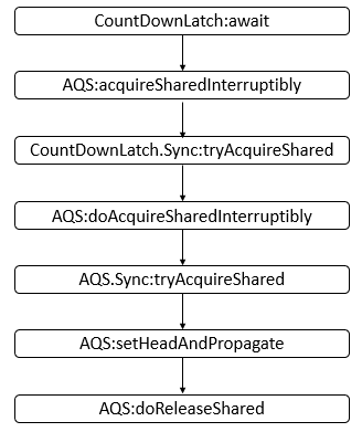 说明: 由源码可知,对CountDownLatch对象的await的调用会转发为对Sync的acquireSharedInterruptibly(从AQS继承的方法)方法的调用。