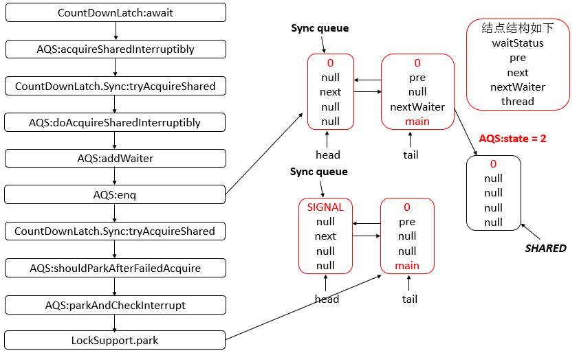 - main线程执行countDownLatch.await操作,主要调用的函数如下。