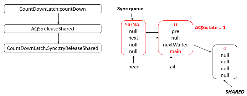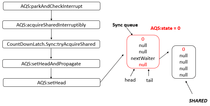 说明: 在AQS的doAcquireSharedInterruptibly中可能会再次调用CountDownLatch的内部类Sync的tryAcquireShared方法和AQS的setHeadAndPropagate方法。