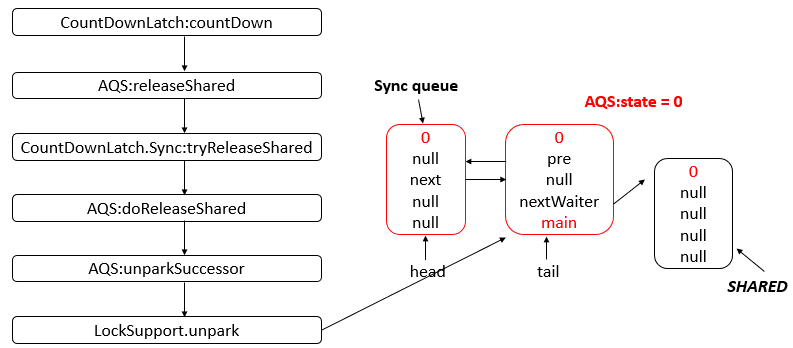 说明: 经过调用后,AQS的state为0,并且此时,main线程会被unpark,可以继续运行。当main线程获取cpu资源后,继续运行。