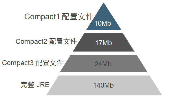 紧凑的JRE分3种,分别是compact1、compact2、compact3,他们的关系是compact1<compact2<compact3,他们包含的API如下图所示