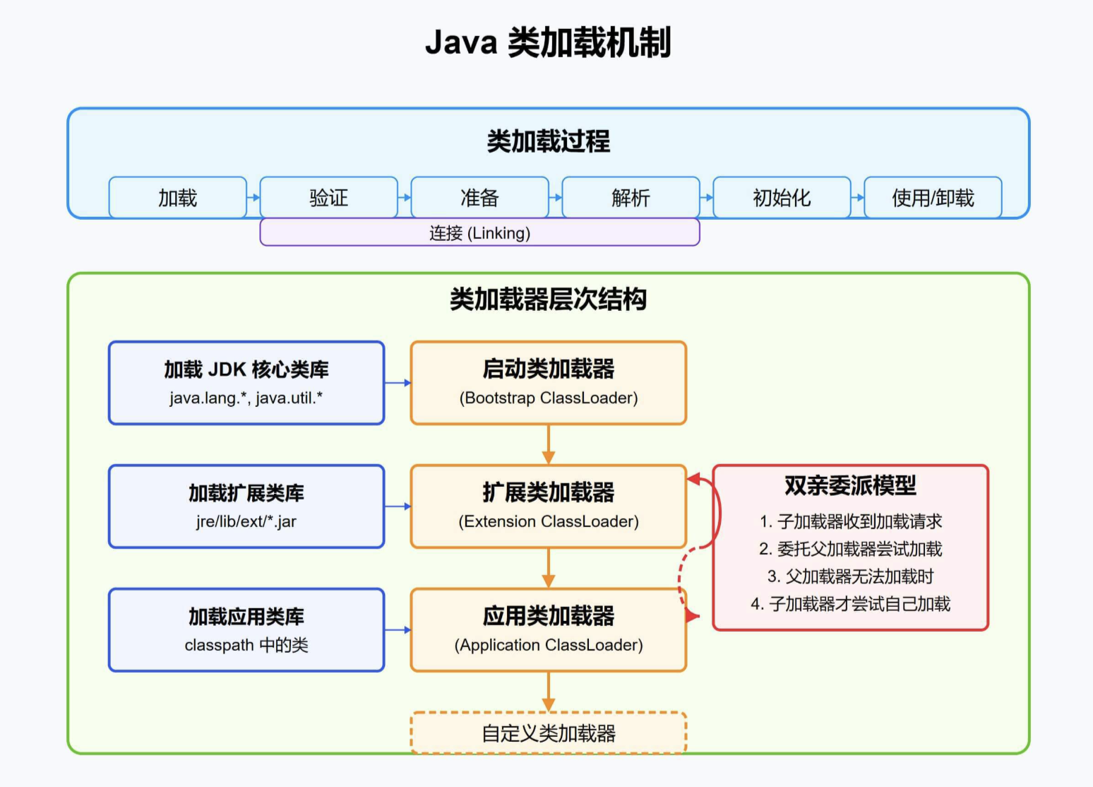 <clinit>()方法的代码。这个阶段是类加载过程的最后一个阶段,在这个阶段,静态变量被赋予正确的初始值,静态代码块被执行。 - 使用(Using):类在被加载、链接和初始化后,就可以被应用程序使用了。在这个阶段,类的实例可以被创建,类的方法可以被调用。