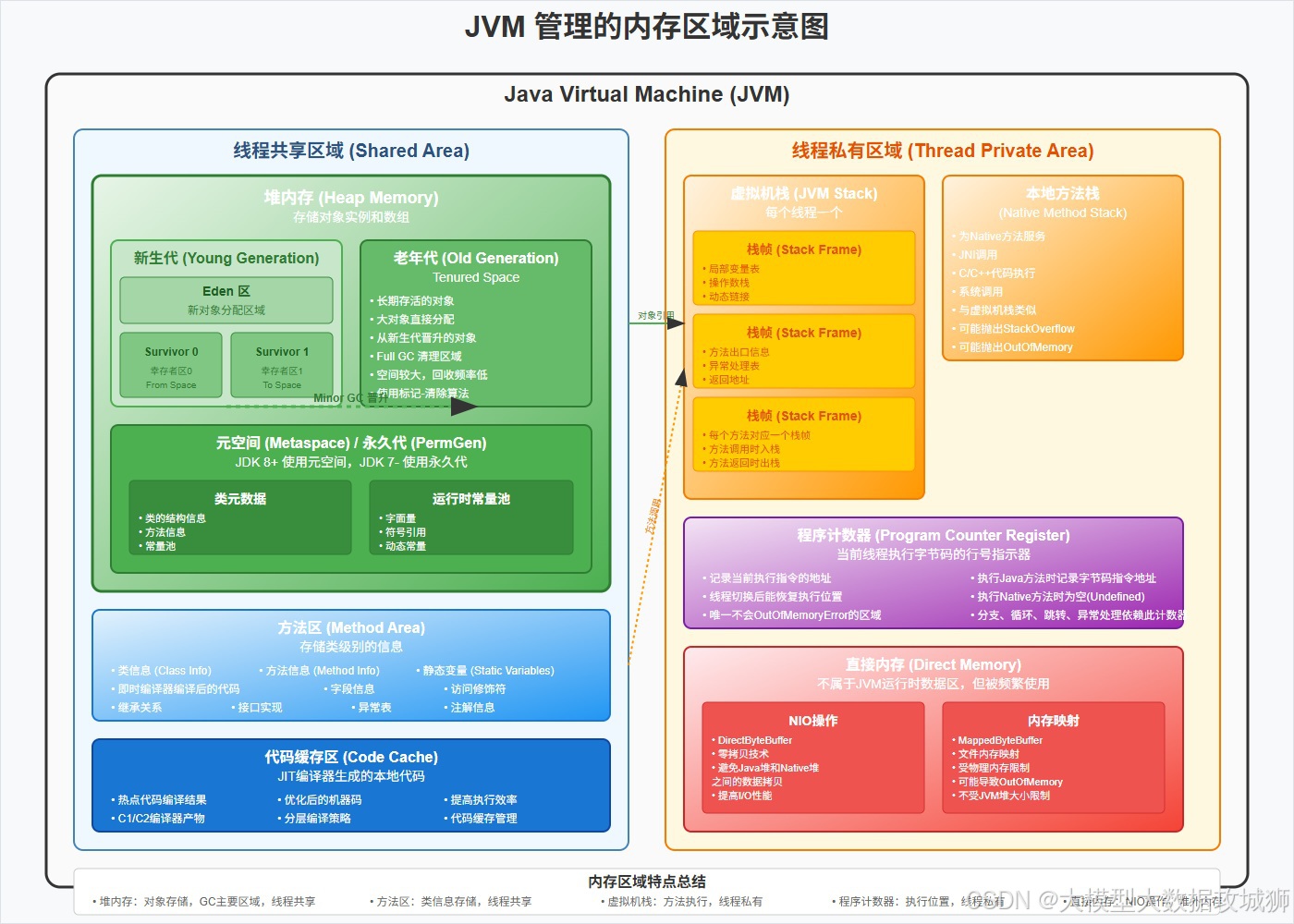 JVM 内存模型主要分为线程私有的区域和线程共享的区域。